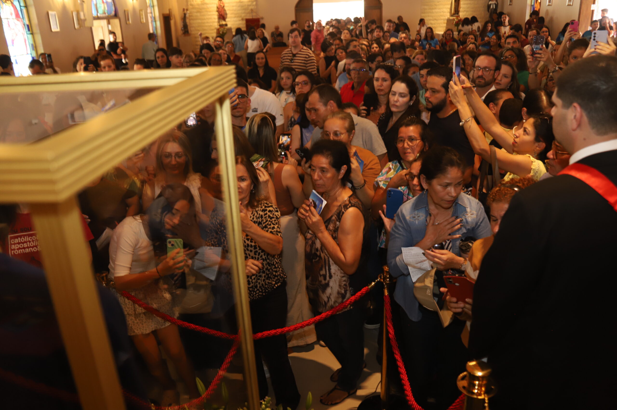 Mais de 4.500 fiéis participaram da celebração na Matriz da Paróquia São Sebastião, que ficou completamente lotada. A emoção tomou conta dos presentes que se espalharam pela parte interna, laterais a céu aberto, estacionamento e salão paroquial. O momento marcou a culminância de meses de oração, mobilização e fé, coroando a canonização de Carlo Acutis, proclamada pelo Vaticano no último dia 7 de setembro.