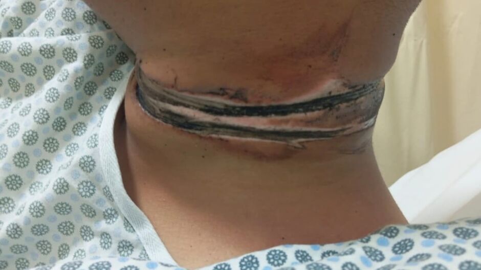 Ele foi socorrido pelo Samu e levado para o Hospital Nossa Senhora Aparecida. O seu pescoço ficou com queimaduras e vergões