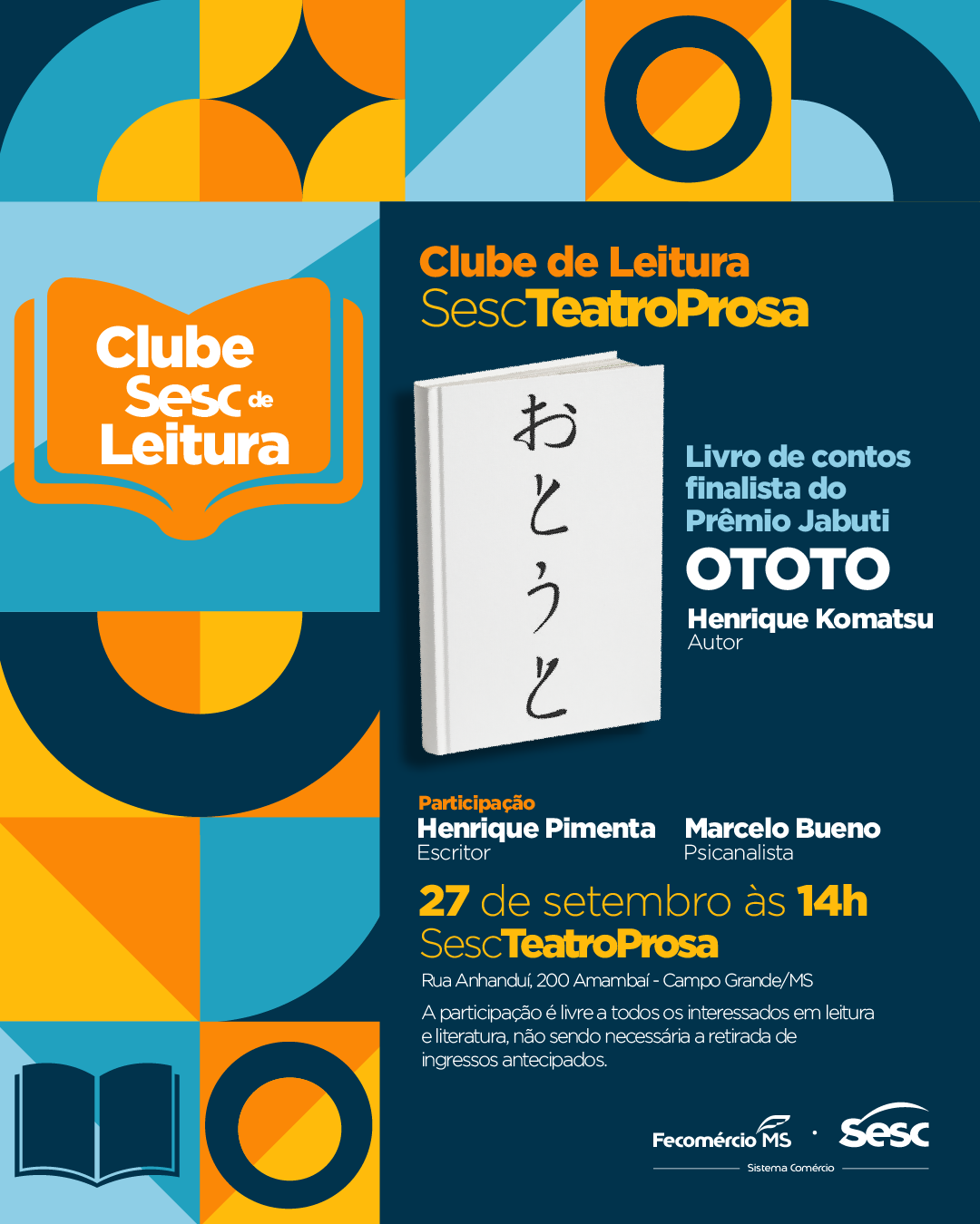 O Sesc Teatro Prosa realiza no dia 27 de setembro, às 14h, mais um encontro do Clube Sesc de Leitura. Esta edição terá a participação do escritor Henrique Komatsu, que irá falar sobre seu livro de contos “Ototo”, finalista do Prêmio Jabuti.