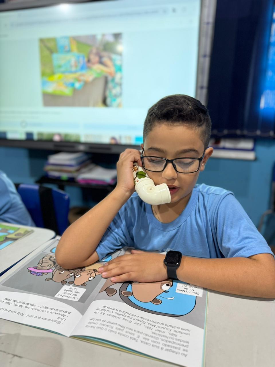 O Sussurrofone, um pequeno dispositivo em formato de telefone, tornou-se essencial para a dinâmica da sala. Ao aproximá-lo do ouvido, cada aluno escuta apenas a própria voz, o que permite uma leitura silenciosa, focada e individual, condição fundamental em um ambiente onde diferentes idades e ritmos de aprendizagem convivem no mesmo espaço. A ferramenta fortalece a fluência, a autoconfiança e a compreensão leitora, ajudando a transformar o momento da leitura em um exercício de escuta interna e concentração.