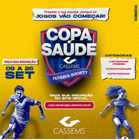 As equipes interessadas em participar da 16ª edição da Copa Cassems já podem se inscrever para a disputa do campeonato. As inscrições, que vão até o dia 26 de setembro, custam R$ 300,00 e podem ser feitas pelo site oficial saude.app.cassems.com.br, na barra “Inscrições”. O pagamento pode ser feito via PIX ou transferência bancária.