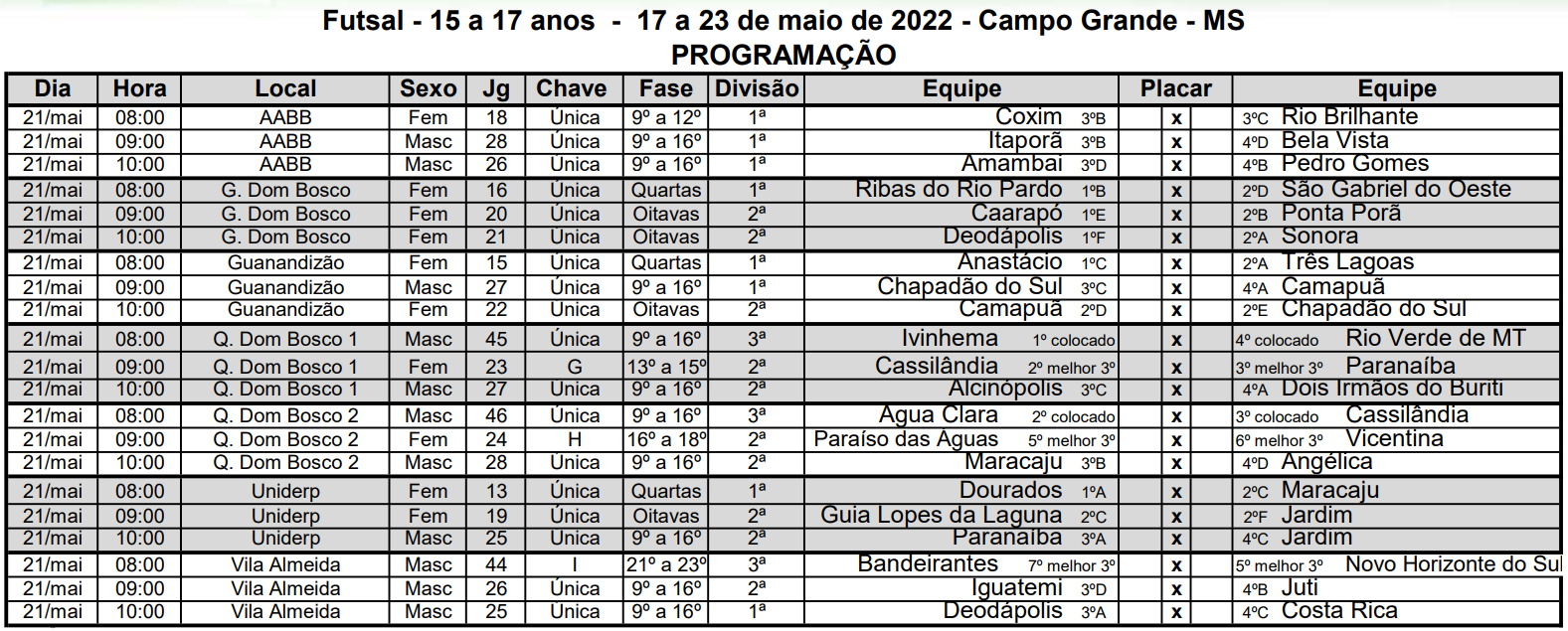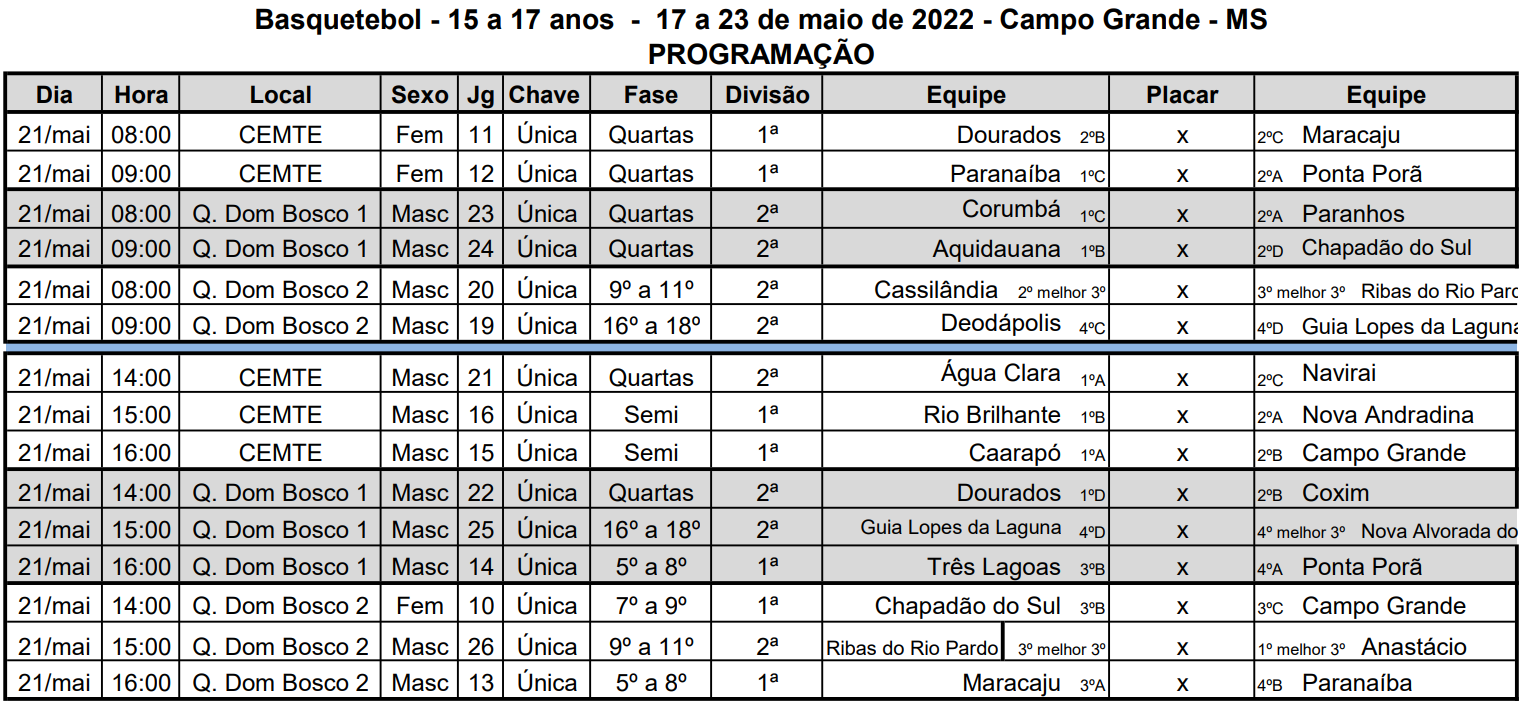 Confira os confrontos do “mata-mata” dos Jogos Escolares da Juventude de MS 2022 – basquetebol/futsal – 15 a 17 anos: