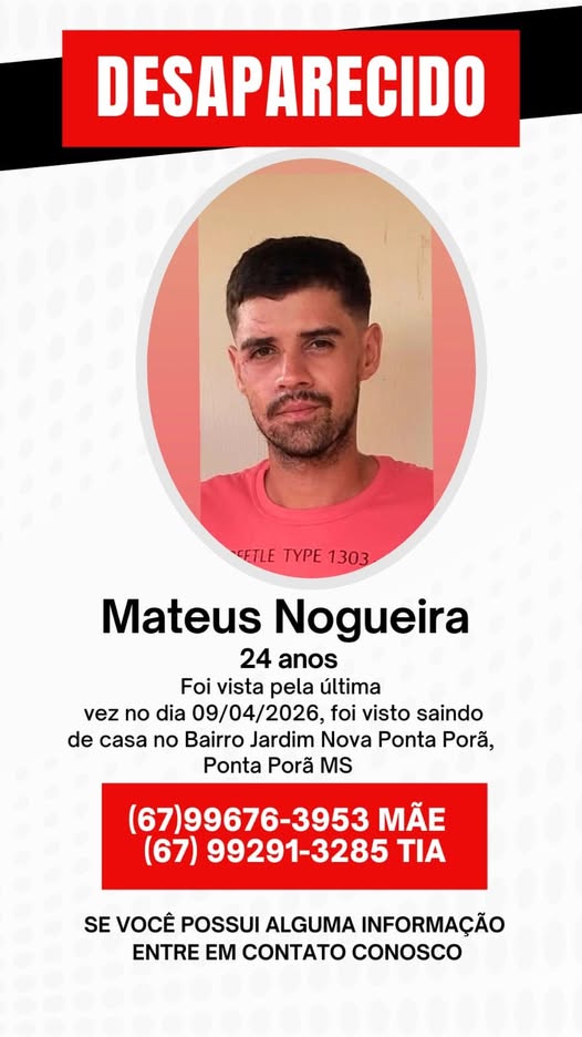 Mãe Andreia mal desembarcou em Ponta Porã, a 313 quilômetros de Campo Grande, em busca de notícias sobre o paradeiro do filho Mateus Nogueira, de 24 anos, desaparecido desde o dia 9 de abril, ou seja, há oito dias, na região, e já recebeu ameaças de uma suposta facção criminosa. Ela pede ajuda para à sociedade por qualquer informação que leve até o filho.