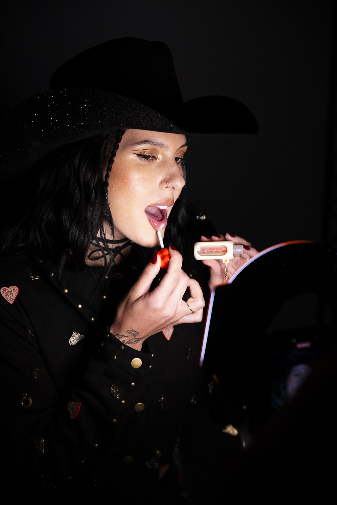 Ana Castela é conhecida por variar entre nudes terrosos e vermelhos clássicos. Julia sugere dois caminhos: um look leve com o a aplicação do Gloss Labial “A Boiadeira By Ana Castela”, que adiciona cor natural, hidratação e efeito fresh e um outro look poderoso, com o Batom Power Stay Líquido Matte, que promete até 16h de fixação, ideal para noite de festas sem retoques.