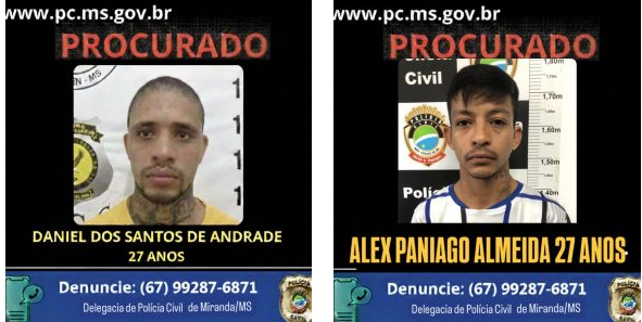 Permanecem foragidos os indivíduos Alex Paniago Almeida e Daniel dos Santos de Andrade. A Polícia Civil solicita colaboração da população para que sejam encaminhadas quaisquer informações acerca do paradeiro dos criminosos. As denúncias podem ser feitas através do número 99223-5802, sendo mantido o sigilo da fonte.