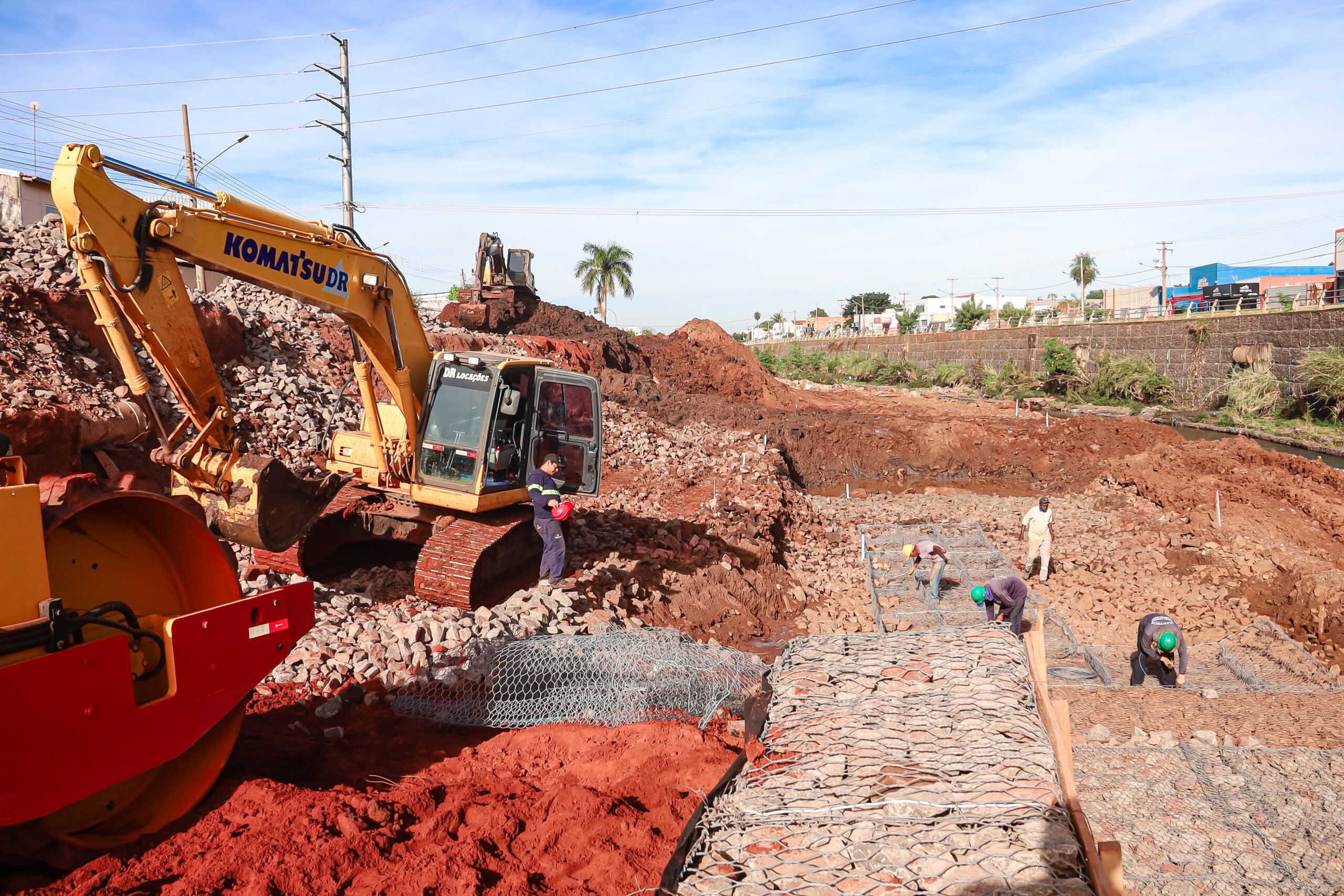 Para proteger a margem do córrego contra processos erosivos, está sendo utilizado o sistema gabião, que demanda técnica especializada e execução cuidadosa. Inicialmente, é feito o preparo do colchão com pedra britada, seguido da instalação das gaiolas metálicas. As pedras, que devem estar limpas, secas e livres de impurezas, são encaixadas manualmente uma a uma dentro dessas estruturas.