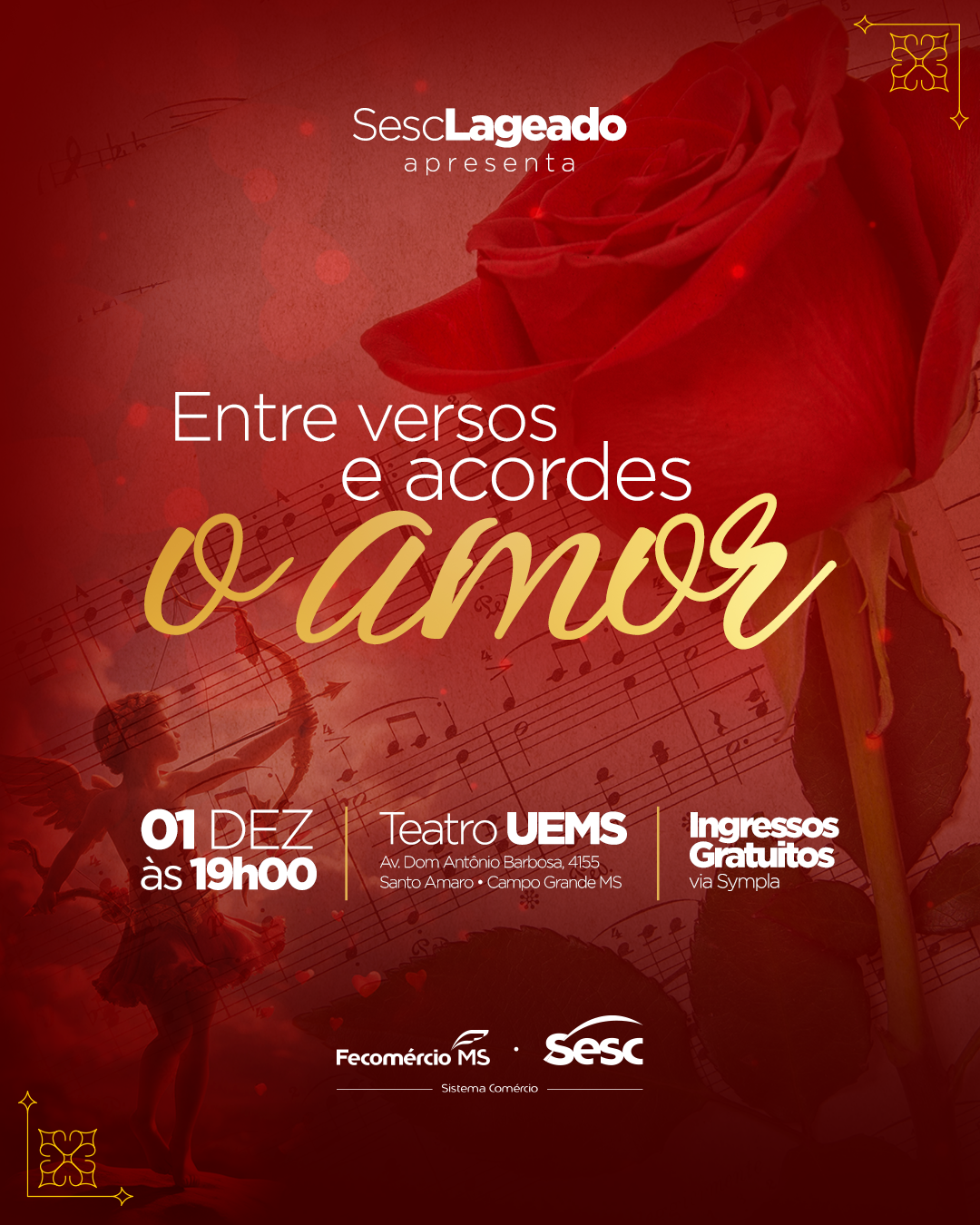 O Sesc Lageado apresenta, no dia 01/12, às 19h, no Teatro da UEMS, o musical “Entre Versos e Acordes: o Amor”, um espetáculo encenado pelos alunos da unidade, sendo desenvolvido pelos professores com o objetivo de promover experiências que valorizem a sensibilidade, o território e a força transformadora da arte.